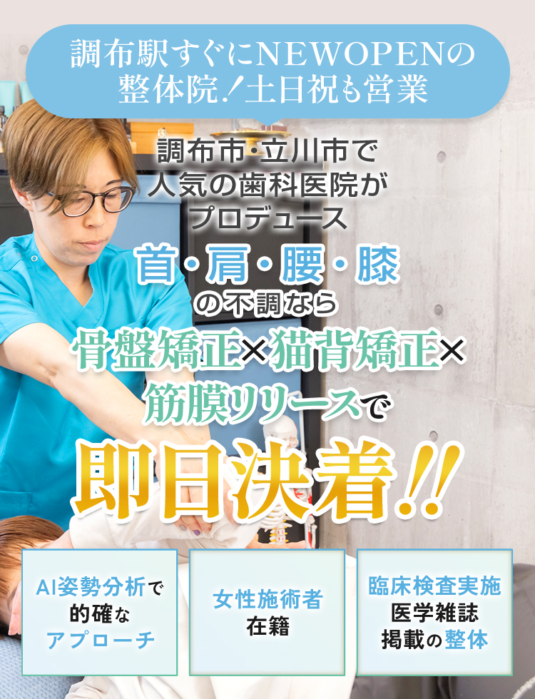 当院では、「解剖学」「西洋医学」「東洋医学」の考え方をもとに生み出された話題のBMK整体を採用しています。身体の土台である骨盤のバランスを整え、自律神経の乱れや血液・リンパ・脳脊髄液などの体内循環の改善を図ることで、全身の不調にアプローチします。